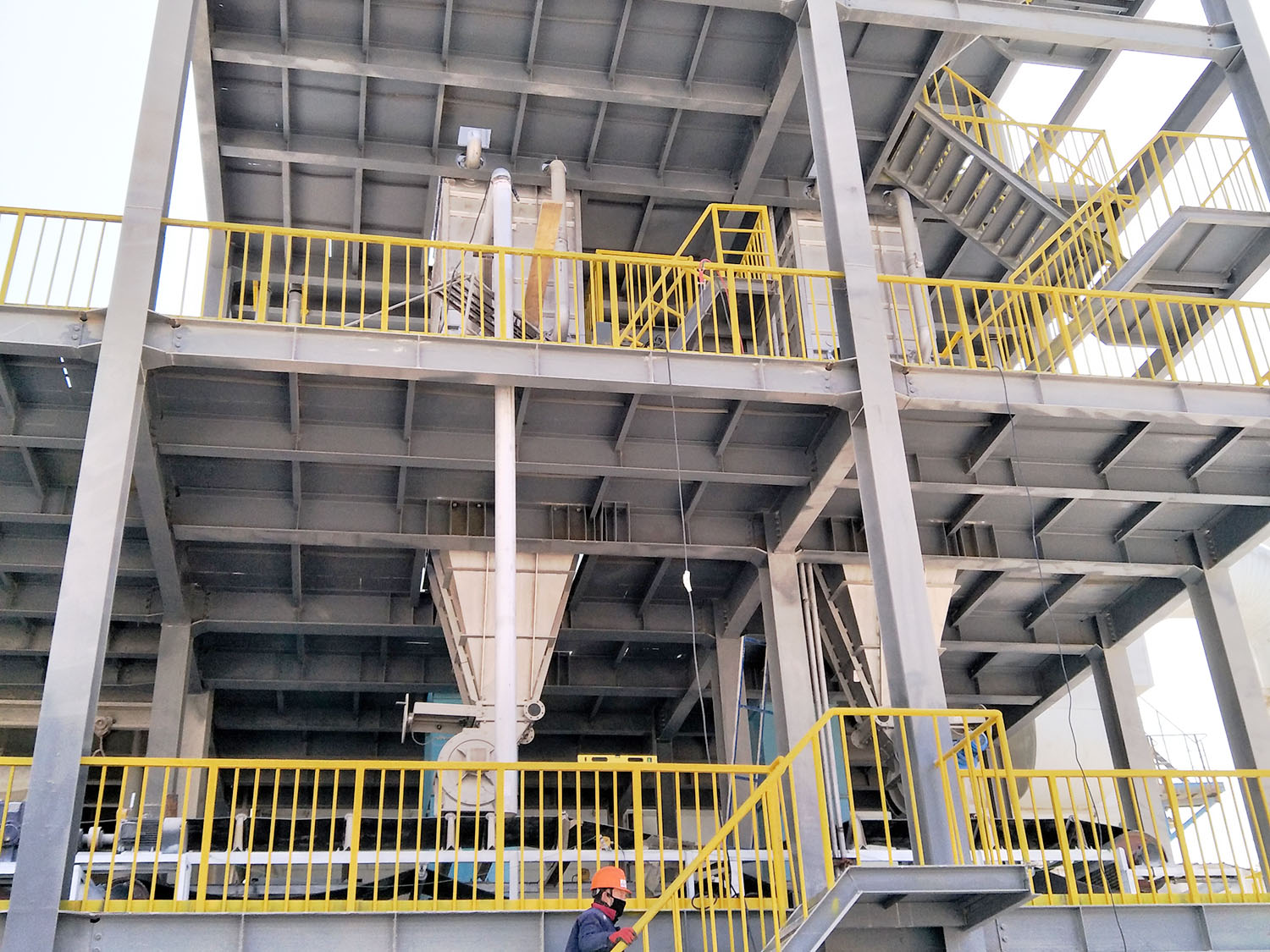 物料经上部的进料仓进入,均匀地分布到传热板组的板片间,进料仓提供缓冲空间。产品缓缓进入一系列空心的、焊接而成的不锈钢传热板组,得以冷却,每块传热板有可供循环冷却水通过的出水和进水歧管,水流与产品流呈逆流状态以达到较大的传热效率。然后进入带旋转阀的密相输送下料锥形成密相输送,产品在板间通道以均一的速率移动,均匀冷却,通过控制旋转阀的转速来调节所需温度和料位。