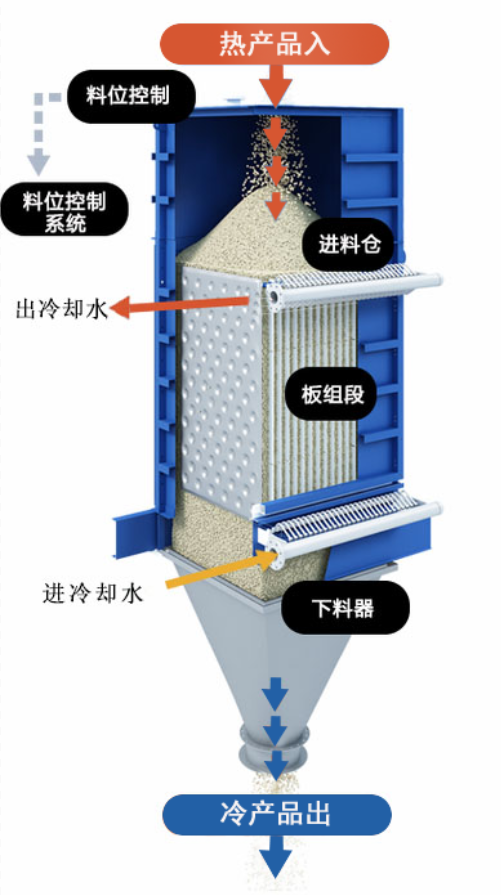 工作示意:粉体在重力作用下缓慢通过板间通道,停留时间长。循环冷却水从传热板内通道流过,密相输送下料装置控制粉体的流速。冷却水与粉体物料之间进行热交换,使得粉体物料得到冷却。