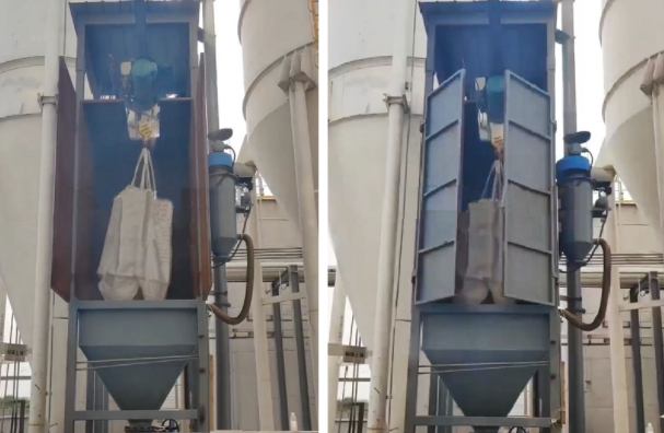 如果是吨袋包装的粉料或者颗粒物料,采用自动化吨袋拆包机,拆袋时,由操作工将吨袋的吊带挂到拆袋机的挂钩上,然后通过拆袋机破袋(吨袋需回收时可改为人工解袋),破袋后物料由于重力作用落到缓冲仓内,该过程中除尘装置会持续工作,收集逸散的粉尘,有效减少卸料过程产生的扬尘。