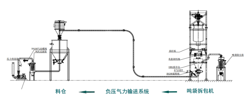 卸料到缓冲仓的物料,经过旋转供料器均匀地落到加速室,利用罗茨风机为输送动力将粉料由加速室通过管道输送到料仓,进行原料的存储。物料在管道内部密闭输送,不会逸散粉尘。尾气通过除尘装置净化后排入空气。