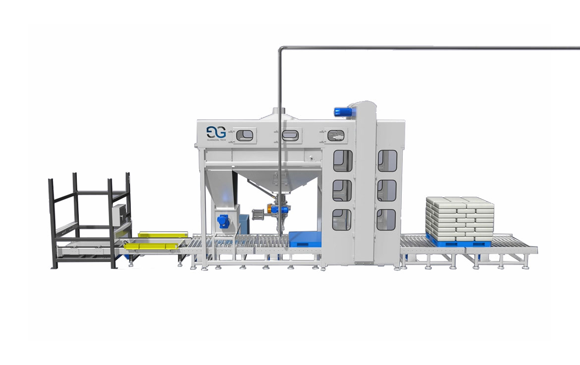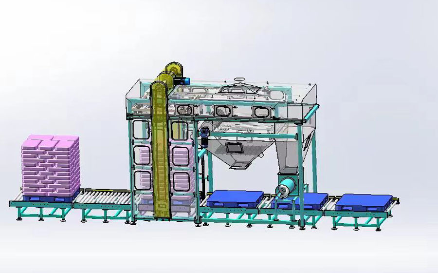 这款全自动拆包机适用于整托盘的小袋装物料拆包卸料作业。作业时,整托盘的物料进入卸垛平台,卸垛机构逐层抓取整层包装,然后向卸料区移动,移动过程中通过一排刀组将物料的包装袋割破,物料落进贮斗中,并通过过滤箱筛除杂质,废袋通过全自动废袋打包机完成废袋自动收集,同时空托盘收集机完成托盘自动收集。整套拆包系统由PLC控制,拆包过程完全实现无人化操作,节省人工,拆包效率高,提升生产效率。