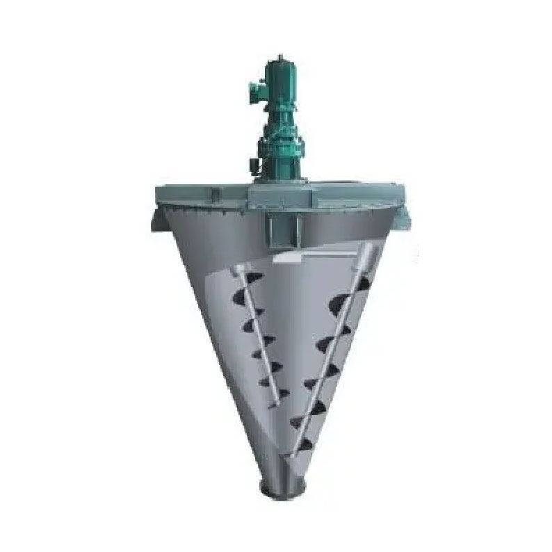 双螺旋锥形混合机属于容器固定式混合机。广泛应用与制药、化工、饲料、食品等行业的各种粉状物料的混合。该机主要由传动系统、两根倾斜螺杆、转臂、筒体、出料阀等组成。这类化工机械对混合物料适应性广,对热敏性物料不会产生过热,对颗粒物料不会压碎和磨碎,对比重悬殊和粒度不同的物料混合不会产生分屑离析现象。