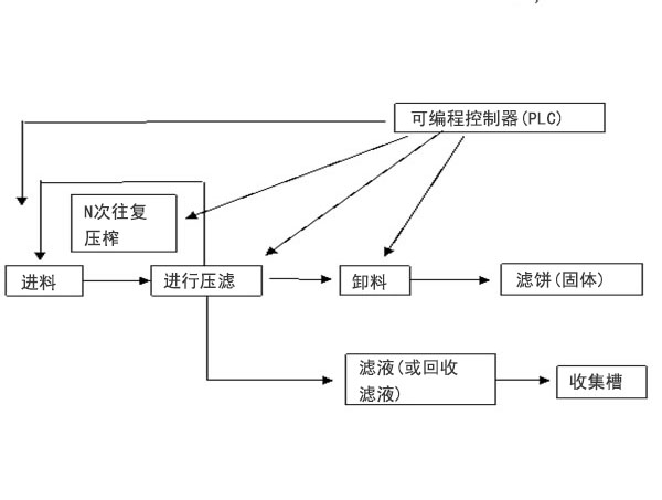3、当到了设定的压榨次数后,即所处理的滤饼到了一定的厚度时,PLC控制压榨机进行一次性保压,保压时间可根据实际操作设定。这样物料中的液体可以尽可能的被挤压出来,从而实现了固液的分离,滤饼的含湿量降低,贵重的液体也尽可能的被回收回来重新利用。打开底阀,卸掉滤饼。