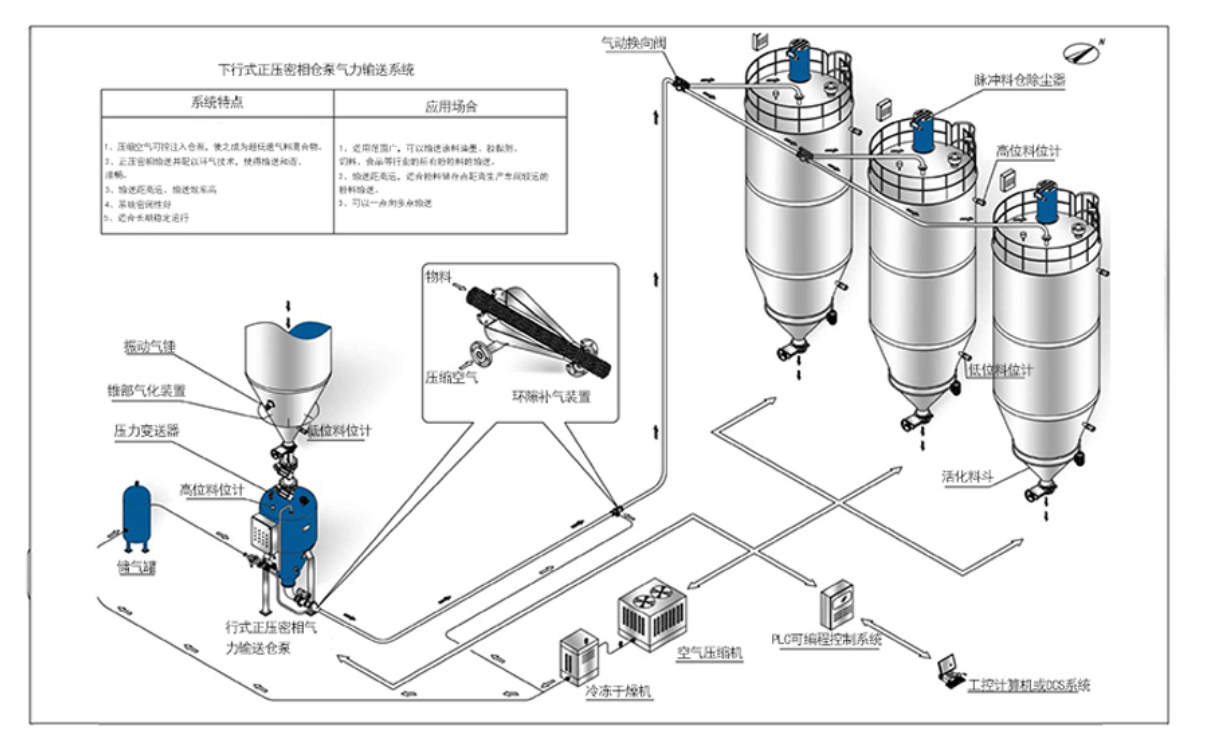- 由连续泵组成气力输送系统,一般设备数量和种类都较少,使得整个系统简捷、可靠;