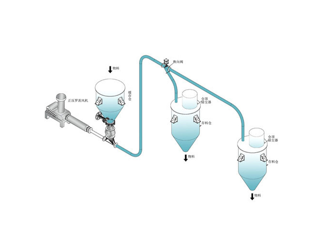 正压稀相气力输送系统是以鼓风机(如罗茨风机)输出的气流为载体将散装粉粒体物料用气流输送进入指定的设备,通过旋转加料器或螺旋给料器将粉粒体物料卸入管道进行压送。